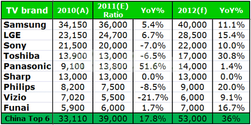 而今年Sharp以日本市場為主軸;Toshiba以日、歐為主要銷售地區(qū),年成長表現(xiàn)衰退;Sony銷售地區(qū)橫跨歐、美、日,除了區(qū)域性需求不振,加上其組織策略反映較緩慢,不僅財報未見起色,年度液晶電視出貨目標更呈現(xiàn)7%之衰退,下修至20百萬臺;Panasonic因購買Sanyo品牌,看似整體市占率提升,但內部獲利壓力頗大,除打算出售位于日本茂原的六代廠,亦將減少8.5代廠的產能,后續(xù)仍須觀察;Philips以歐洲為主要市場,難幸免于歐債風暴沖擊;Vizio面臨與LGD之合作關系生變,加上北美市場不景氣,年度銷售量下滑幅度甚鉅;反觀大陸品牌挾帶雄厚資源,年度銷售量成長依舊維持在17~18%左右,市占率更達19~20%,2012更預估有3成之成長力道。