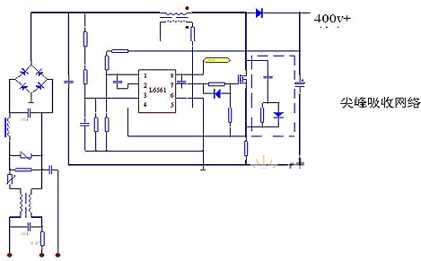 3.在低電壓時(shí),MOS 的升壓電流更大(PWM 輸出導(dǎo)通較寬)MOS 溫升較高。這時(shí)可將電壓范圍設(shè)定為接近值,例如:120v~260v 時(shí)同等負(fù)載測試時(shí),可將電感的感量及匝數(shù),按照260v 時(shí)的輸入值,設(shè)定并最大可能減少次級匝數(shù)。在120v 時(shí)可將輸入最低電壓設(shè)定為110v最大限度增加電感感量,使母線在110v 滿載時(shí)輸出達(dá)到額定的400v。在260v 時(shí)設(shè)定次級是由于輸入電壓升高,輸入電流減小會(huì)使次級電壓下降,5 腳電流采樣失效,使芯片進(jìn)入重新啟動(dòng)(誤以為空載)母線不斷脈動(dòng)的重新啟動(dòng)。110V 調(diào)試時(shí)感量大,可減少因輸入電壓低而導(dǎo)致的PWM 頻率太高,帶來的MOS 開關(guān)損耗,感量大時(shí)亦可有效減少峰值電流的值。另一減少M(fèi)OS 溫升的方式是并聯(lián)一路吸收網(wǎng)絡(luò)。電阻并聯(lián)高速二極管后在串聯(lián)一只電容可使MOS 開關(guān)時(shí)的尖峰反向電壓得到有效吸收。(小功率無明顯優(yōu)勢)。