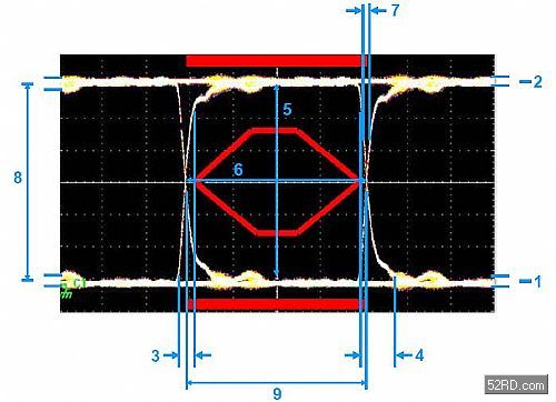 通過(guò)在示波器的垂直軸對(duì)數(shù)字信號(hào)進(jìn)行反復(fù)采樣、同時(shí)采用相應(yīng)數(shù)據(jù)率對(duì)水平時(shí)間掃描進(jìn)行觸發(fā)來(lái)生成眼圖。所獲得的圖形看上去象眼睛,如圖1所示。“眼睛”越大,數(shù)據(jù)完整性越高。通常采用模板(mask)來(lái)對(duì)可接受的信號(hào)質(zhì)量進(jìn)行定義。這模板由“眼睛”中間的六角形和“眼睛”上、下的矩陣組成。如果測(cè)得的信號(hào)跡線(xiàn)穿越模板的邊線(xiàn),那么信號(hào)質(zhì)量就不可接受。USB2.0信號(hào)模板規(guī)范由USB應(yīng)用者論壇(USBIF,www.usb.org)提供,可參見(jiàn)USB2.0版規(guī)范第7.1.2.2章節(jié)。圖1中顯示了帶有詳細(xì)臨界點(diǎn)的眼圖。