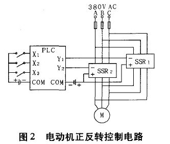 圖2為PLC控制的三相交流電動機正反轉控制電路,其中X1、X2、X3,分別表示PLC的輸入,控制電動機的轉動方向與起停;Y1、Y1表示PLC的輸出。當Y1有效時,SSR1輸入端得到DC24V的直流信號,則三相輸出端從斷態(tài)轉變成通態(tài),三相交流電動機得電,反轉;同理當Y 有效時,SSR2的三相輸出端接通,因A、c換向則電動機正轉。
