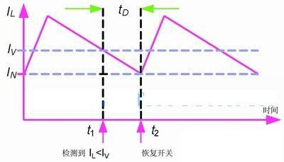 一般而言,通常采用比較器來檢測IL是否超出IV,以決定關(guān)斷或重新開通。可是,比較器會帶來延時tD,影響閾值的有效值。如圖2所示,比較器在t1時刻檢測到IL< p> V,可是偶遇延時tD,開關(guān)會在t2時刻被恢復(fù)?;谶@個原因,有效閥值IN便會低于IV,這樣,實際的輸出IOUT(CL)為: