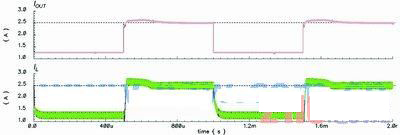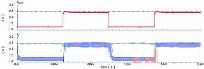 為了說明這個方案,圖1中的降壓轉(zhuǎn)換器會采用這些配置:L=20mH、COUT=47mF、RL值在2.64W(正常模式)~1.1W(電流限制模式)間轉(zhuǎn)換,并會使用一個tD=100ns的比較器,而IOUT(CL,DES)和IL(RIPPLE)分別是2.5A和0.3A。不過,如果使用傳統(tǒng)的峰值電流限制方法,那么式(1)中的IV便會設(shè)定為2.35A,傳統(tǒng)方法的模擬結(jié)果如圖4所示。由此可以看到,IOUT(CL)會由于tD的影響而低于2.5A。然而,使用新方法并將ILR設(shè)定在2.5A,IOUT(CL)便可如圖5所示達(dá)到2.5A。于是,傳統(tǒng)方法中出現(xiàn)的問題便能夠在該方案中解決。