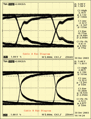 圖4是實(shí)際應(yīng)用的眼圖情況,很明顯電纜B的眼圖要比電纜A的眼圖要好,和前面的仿真結(jié)果比較吻合,不過電纜A的實(shí)際反射比較大一點(diǎn),這和仿真使用驅(qū)動(dòng)器件的模型有關(guān)。