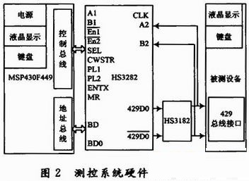 接口的實現(xiàn)方式選用Intersil公司的HS3282芯片,它支持ARINC429通信規(guī)范和其他串行數(shù)據(jù)傳輸協(xié)議,采用+5 V供電。具有兩路接收、一路發(fā)送的功能。通道接收器之間也是獨立的并行接收,可以直接連接到ARINC429總線,而不需電平轉(zhuǎn)換。使用時和HS3182總線驅(qū)動器配合,就可以發(fā)送數(shù)據(jù)進行二級差分驅(qū)動,產(chǎn)生ARINC429總線的電平。HS3282數(shù)據(jù)總線為16位,MSP430F449為16位單片機,從而避免了8位單片機為解決系統(tǒng)總線匹配的問題需要采用鎖存器作為虛擬總線的煩惱,提高了測控系統(tǒng)的可靠性。