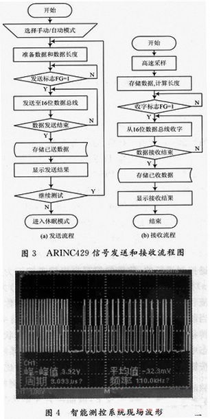 對此便攜式低功耗雷達導(dǎo)航儀智能測控系統(tǒng)的測試內(nèi)容包括:發(fā)送數(shù)據(jù)、接收數(shù)據(jù)和發(fā)送數(shù)據(jù)間隔等測試。由于HS3282的兩路輸出是差分輸出的,所以只需要測試其中的一路就可以了。智能測控系統(tǒng)現(xiàn)場波形如圖4所示,發(fā)送的數(shù)據(jù)采用自動模式,控制字為奇校驗。通過示波器直接觀察HS3282芯片的輸出信號,輸出電平是3.92 V,滿足TTL的電平要求。而數(shù)據(jù)之間的時間間隔,即組間數(shù)據(jù)4位間隔。由單片機的延時程序即可完成。