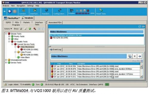 除了附加有視頻PID帶寬測量以外,VQS1000的顯示和操作幾乎與MTM400A的文件模式應(yīng)用一樣。VQS1000的另一項(xiàng)功能是當(dāng)它與MTM400A聯(lián)用時(shí),所有的觸發(fā)均通過SNMP返回到MTM400A。此外,還有一項(xiàng)測試稱為AV質(zhì)量測試也是很有用的,如圖3所示,MTM400A可以跟蹤VQS1000黑幀、凍結(jié)幀和塊效應(yīng)測量的觸發(fā)事件。