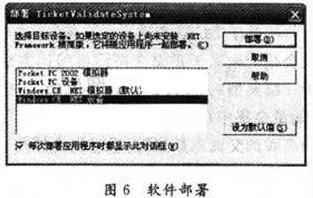 在Visual Studio 2003中進(jìn)行軟件設(shè)計,并在模擬器中調(diào)試成功之后,就可以將軟件下載到實驗平臺中運行,在軟件進(jìn)行部署前安裝ActiveSync 4.1,并在軟件進(jìn)行部署時選中“Windows CE.NET、設(shè)備”見圖6。
