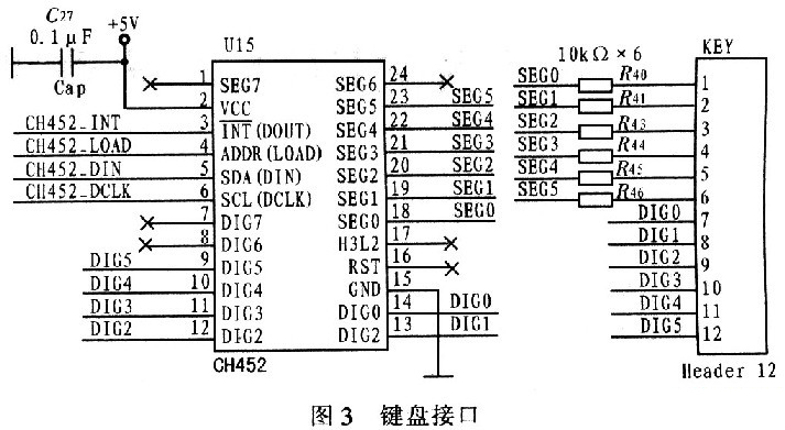 為便于用戶使用,該系統(tǒng)共36個(gè)按鍵,其中有26個(gè)英文字母按鍵、4個(gè)快速功能按鍵、4個(gè)方向按鍵以及確定和取消按鍵,這些按鍵制作成6x6的薄膜開(kāi)關(guān)按鍵。所有按鍵均有CH452器件控制,這樣可降低主處理器的工作負(fù)擔(dān),大大簡(jiǎn)化了軟件編寫(xiě)程序。CH452內(nèi)置64鍵鍵盤(pán)控制器,基于8x8矩陣鍵盤(pán)掃描;內(nèi)置按鍵狀態(tài)輸入的下拉電阻;內(nèi)置去抖動(dòng)電路;鍵盤(pán)中斷,可以選擇低電平有效輸出或者低電平脈沖輸出;提供按鍵釋放標(biāo)志位,可供查詢按鍵按下與釋放;支持按鍵喚醒,處于低功耗節(jié)電狀態(tài)中的CH452可以被部分按鍵喚醒。