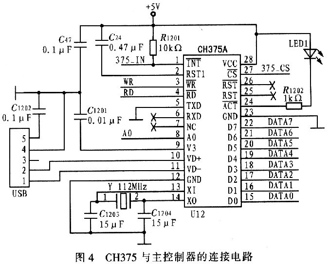 為便于儀器現(xiàn)場(chǎng)使用方便,該系統(tǒng)設(shè)計(jì)了對(duì)外信息輸送的USB接口,可使儀器便捷地與各類(lèi)存儲(chǔ)器及電腦連接。其中,USB接口控制器采用CH357器件。CH357支持USB-HOST主機(jī)方式和USBDEVICE/SLAVE設(shè)備方式。在本地端CH375具有8位數(shù)據(jù)總線和讀、寫(xiě)、片選控制線以及中斷輸出,可方便地掛接到ATxmegal28Al微控制器的系統(tǒng)總線上。圖4為CH375與主控制器的連接電路,CH375的TXD引腳直接接地,從而使CH375工作于并口方式。電容C1201用于CH375內(nèi)部電源節(jié)點(diǎn)退耦,采用0.01μF的高頻瓷片電容,可提高接口的EMI要求。電容C47和C1202用于外部電源退耦,采用0.1μF的高頻瓷片電容。晶體X11、電容C1203和C1204用于CH375的時(shí)鐘振蕩電路。USB-HOST主機(jī)方式要求時(shí)鐘頻率比較準(zhǔn)確,X11的頻率是12 MHz±0.4‰,C1203和C1204是容量約為15 pF的獨(dú)石電容。LEDl為數(shù)據(jù)傳送指示燈,用戶可以直觀觀察數(shù)據(jù)傳送狀態(tài)。