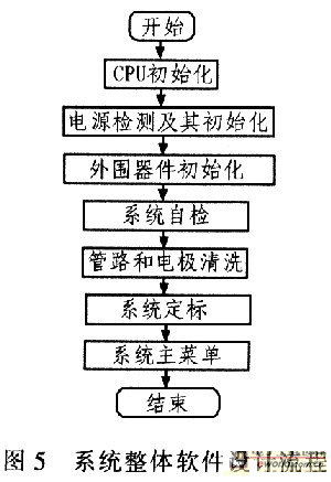 該系統(tǒng)軟件開(kāi)發(fā)采用ATMEL公司提供的AVRStudio開(kāi)發(fā)環(huán)境,并在該開(kāi)發(fā)環(huán)境中內(nèi)嵌了支持C語(yǔ)言的GCC。分析儀軟件全部采用C語(yǔ)言編寫(xiě),這樣開(kāi)發(fā)周期縮短,維護(hù)便捷。該系統(tǒng)軟件設(shè)計(jì)采用層次化模塊化結(jié)構(gòu)設(shè)計(jì),共分為兩個(gè)層次,第l層是按照硬件各個(gè)功能模塊編寫(xiě)相應(yīng)的驅(qū)動(dòng)和接口程序,包括液晶顯示、打印機(jī)、按鍵處理、步進(jìn)電機(jī)、A/D采集轉(zhuǎn)換、系統(tǒng)時(shí)鐘、檢測(cè)和電源管理等模塊;第2層是在第1層的基礎(chǔ)上按照使用功能編寫(xiě)的應(yīng)用程序模塊,有主菜單、樣本分析、質(zhì)控分析、質(zhì)控統(tǒng)計(jì)、系統(tǒng)設(shè)定、系統(tǒng)校準(zhǔn)、電極清洗、數(shù)據(jù)儲(chǔ)存及查詢和系統(tǒng)自檢等模塊。圖5中給出系統(tǒng)整體軟件設(shè)計(jì)流程。