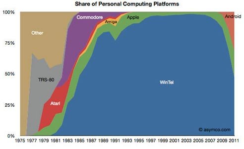 美國市場調研公司Asymco分析師賀拉斯·德迪歐(Horace Dediu)發(fā)布報告稱,傳統(tǒng)x86架構Windows PC(Wintel)在全球個人計算設備中的份額已經降至50%左右。在1995年至2005年期間,Wintel曾幾近完全壟斷個人計算設備。