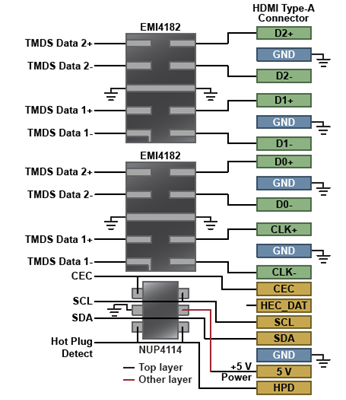 一種是四個高速對、多達(dá)6條額外接口線、低電容ESD +共模濾波器EMI4182,符合電容<0.5 pF和共模濾波要求,具有0.4 pF ESD保護、共模(CM)抑制(500 MHz為15 dB)、差模(DM)插入損耗(500 MHz為1.0 dB)、高速線路穿越型布線、業(yè)界領(lǐng)先的低鉗位電壓等特性。