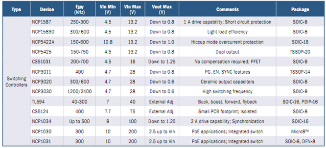 安森美半導(dǎo)體的開關(guān)控制器的關(guān)鍵特性包括寬輸入電壓范圍、緩沖的外部高于1.25 V的電壓參考、電源良好+啟用/禁用引腳、外部同步和輸出過壓和欠壓保護。根據(jù)型號不同,具有支持短路保護、高輕載能效、斷續(xù)(hiccup)模式過流保護、雙輸出、無需補償、PG/EN/SYNC功能、使用陶瓷輸出電容、高開關(guān)頻率、降壓/升壓/正前/反激、支持小PCB面積、支持隔離、PoE應(yīng)用、集成開關(guān)等特性,詳見下表。