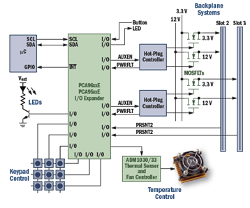 安森美半導(dǎo)體的級聯(lián)I/O擴展器采用I2C和SMBus接口和1 MHz的SCL時鐘頻率,具有30 mA SDA灌電流能力,可用于背板系統(tǒng)等應(yīng)用,實現(xiàn)鍵盤控制、溫度控制、熱插拔控制等功能。圖6是背板系統(tǒng)的各種控制功能。