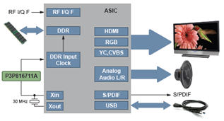 在機頂盒的DDR存儲器EMI抑制應(yīng)用中,使用P3P816711A可降低1倍LVCMOS峰值EMI,可30 MHz的輸入?yún)⒖紩r鐘,并提供30 MHz ± 0.3%輸出時鐘。