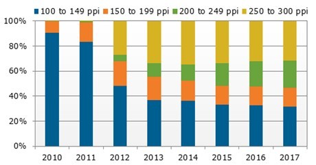 隨著市場發(fā)展,平板電腦本身規(guī)格也不斷地的進步。更高的像素將使平板電腦將具有理想多媒體體驗。在接下來幾個季度,面板的分辨率和像素將進一步提高;我們預估,2012年200-300ppi像素的滲透率將達30%,到了2017年可達到47.5%。