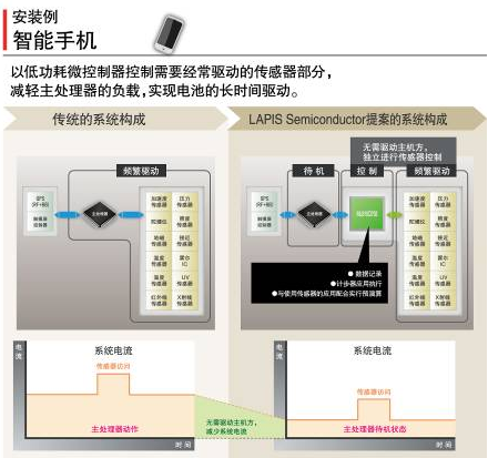 羅姆集團旗下的LAPIS Semiconductor面向智能手機市場開發(fā)出了可用更低耗電量綜合控制各種傳感器的、世界最小級別的低功耗微控制器“ML610Q792”。最近,在手機中智能手機所占的比率日益增加,而為了提供新的應用和服務不斷增加的傳感器群,導致智能手機的電池負載持續(xù)上升。LAPIS Semiconductor著眼于這種情況,將需要頻繁驅動的傳感器群從主處理器分離,通過低功耗微控制器進行控制,減輕了主處理器的負載,從而實現(xiàn)了電池的長時間驅動。另外,利用本微控制器的特點——即耗電量低的特性,通過與無線通信的組合,亦適用于傳感器網(wǎng)絡模塊等應用。