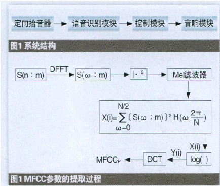 車載語(yǔ)音控制器系統(tǒng)由定向拾音器、語(yǔ)音識(shí)別模塊、控制模塊和音響模塊組成。系統(tǒng)的功能是:由拾音器采集駕駛員發(fā)出的語(yǔ)音命令,利用語(yǔ)音識(shí)別模塊將拾音器輸出的語(yǔ)音物理聲音信號(hào)轉(zhuǎn)變成語(yǔ)音數(shù)字信號(hào),并識(shí)別出語(yǔ)音命令對(duì)應(yīng)的漢字或詞語(yǔ),之后由控制模塊產(chǎn)生與之對(duì)應(yīng)的詞條編碼指令,通過(guò)系統(tǒng)I/O口線將控制命令傳達(dá)給音響,車載音響接收到控制指令產(chǎn)生動(dòng)作,響應(yīng)駕駛員的語(yǔ)音命令,比如快進(jìn)、快退或音量調(diào)節(jié)等。系統(tǒng)結(jié)構(gòu)及原理框圖如圖1 所示: