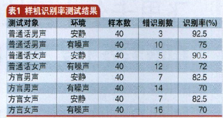 本系統(tǒng)的樣機(jī)實(shí)驗(yàn)主要是測(cè)試非特定人的語(yǔ)音識(shí)別率和模擬開(kāi)關(guān)動(dòng)作的準(zhǔn)確率。由于汽車音響的語(yǔ)音詞條為2~4個(gè)字,語(yǔ)音識(shí)別率實(shí)驗(yàn)內(nèi)容為車載音響常用2字詞條指令18條、3字詞條指令12條、4字詞條指令10條,實(shí)驗(yàn)對(duì)象為6人4男、2女(普通話和方言),實(shí)驗(yàn)環(huán)境為噪聲干擾環(huán)境和相對(duì)安靜環(huán)境,樣機(jī)測(cè)試結(jié)果如表1所示?! ?/p>