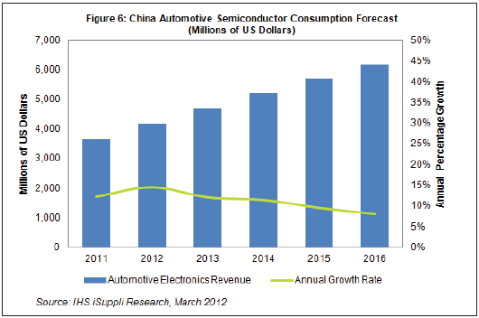 中國(guó)汽車半導(dǎo)體市場(chǎng)過去幾年快速增長(zhǎng),2010年中國(guó)汽車半導(dǎo)體消費(fèi)額銳增58%,達(dá)到32億美元。中國(guó)汽車需求旺盛,而中國(guó)消費(fèi)者收入增加和政府刺激政策幫助提高了汽車銷量,這些因素都有利于中國(guó)汽車電子市場(chǎng)的擴(kuò)張。