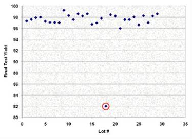 圖4最終測試良率(超負載試驗前)和標(biāo)出不符合統(tǒng)計良率限值的點的示例圖。該點是一個異常值,是要求進一步篩選和分析的風(fēng)險點,也可能會出現(xiàn)不合格品?! ?/p>