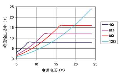 D 類放大器MOSFET輸出級的導(dǎo)通電阻會(huì)影響它的效率和峰值電流能力。降低負(fù)載的峰值電流可減少M(fèi)OSFET的I2R損耗,進(jìn)而提高效率。要降低峰值電流,應(yīng)在保證輸出功率, D類放大器的電壓擺幅以及電源電壓的限制的條件下,選擇最大阻抗的揚(yáng)聲器,如圖4所示。本例中,假設(shè)D類放大器的輸出電流為2A,電源電壓范圍為 5~24V。電源電壓大于等于8V時(shí),4Ω的負(fù)載電流將達(dá)到2A,相應(yīng)的最大連續(xù)輸出功率為8W。如果8W的輸出功率能滿足要求,則可以考慮使用一個(gè) 12Ω揚(yáng)聲器和15V供電電壓,此時(shí)的峰值電流限制在1.25A,對應(yīng)的最大連續(xù)輸出功率為9.4W。此外,12Ω負(fù)載的工作效率要比4Ω負(fù)載的高出 10%~15%。實(shí)際效率的提高根據(jù)不同D類放大器而異。雖然大多數(shù)揚(yáng)聲器的阻抗都采用4Ω或8Ω,但也可采用其他阻抗的揚(yáng)聲器實(shí)現(xiàn)更高效的散熱。