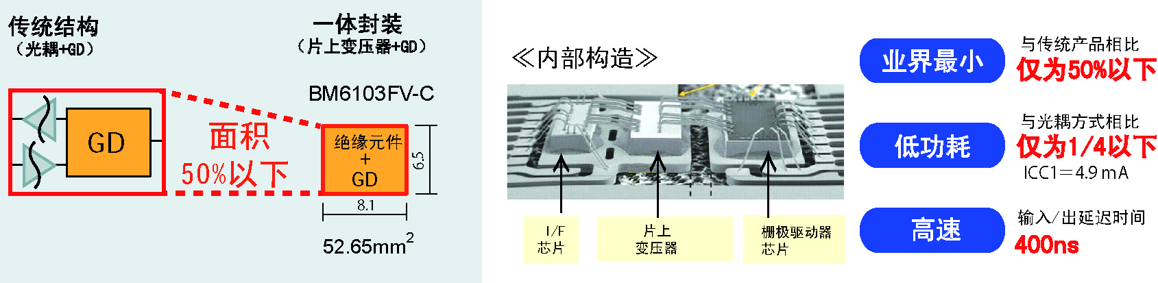 此次羅姆采用獨創(chuàng)的微細加工技術(shù),開發(fā)出片上變壓器工藝,進而成功開發(fā)出小型并且內(nèi)置了絕緣元件的柵極驅(qū)動器。無需外置零件,同時通過采用小型封裝,與傳統(tǒng)產(chǎn)品相比,安裝面積減少了約50%。不僅如此,由于內(nèi)置車載逆變器電路所需的全部保護功能,不僅有助于實現(xiàn)逆變器的小型化,還非常有助于減輕設(shè)計負(fù)擔(dān)。