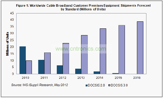 據(jù)IHS iSuppli公司的寬帶與數(shù)字家庭市場追蹤報告,2011年寬帶電纜運營商增加布署DOCSIS 3.0,使得該標(biāo)準(zhǔn)首次成為多數(shù)新寬帶有線設(shè)備的主要標(biāo)準(zhǔn)。