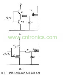 圖1(a)為常用的小功率驅(qū)動電路,簡單可靠成本低。適用于不要求隔離的小功率開關(guān)設(shè)備。圖1(b)所示驅(qū)動電路開關(guān)速度很快,驅(qū)動能力強,為防止倆個MOSFET管直通,通常串接一個0.5~1Ω小電阻用于限流,該電路適用于不要求隔離的中功率開關(guān)設(shè)備。這兩種電路結(jié)構(gòu)特簡單。