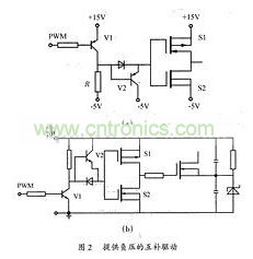 功率MOSFET屬于電壓型控制器件,只要柵極和源極之間施加的電壓超過其閾值電壓就會導(dǎo)通。由于MOSFET存在結(jié)電容,關(guān)斷時其漏源兩端電壓的突然上升將會通過結(jié)電容在柵源兩端產(chǎn)生干擾電壓。常用的互補驅(qū)動電路的關(guān)斷回路阻抗小,關(guān)斷速度較快,但它不能提供負壓,故其抗干擾性較差。為了提高電路的抗干擾性,可在此種驅(qū)動電路的基礎(chǔ)上增加一級由V1、V2、R組成的電路,產(chǎn)生一個負壓,電路原理圖如圖2(a)所示。