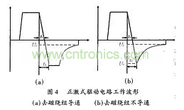 電路原理圖如圖3(a)所示,N3為去磁繞組,S2為所驅(qū)動的功率管。R2為防止功率管柵極、源極端電壓振蕩的一個阻尼電阻。因變壓器漏感較小,且從速度方面考慮,一般R2較小,故在分析中忽略不計。其工作波形分為兩種情況,一種為去磁繞組導(dǎo)通的情況,見圖4(a);一種為去磁繞組不導(dǎo)通的情況,見圖4(b)。