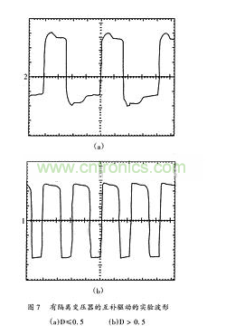 6(b)為占空比大于0.5時適用的驅(qū)動電路,其中Z2為穩(wěn)壓二極管,此時副邊繞組負電壓值較大,Z2的穩(wěn)壓值為所需的負向電壓值,超過部分電壓降在電容C2上,其實驗波形見圖7(b)。