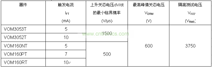 新的VOM160和VOM305x系列具有三種輸出觸發(fā)LED電流:5mA(VOM160NT/VOM3053T),7mA(VOM160PT)和10mA(VOM160RT/VOM3052T)。這些器件的封裝高度只有2.0mm,交流閉鎖電壓高達(dá)600V,可用于高壓應(yīng)用。
