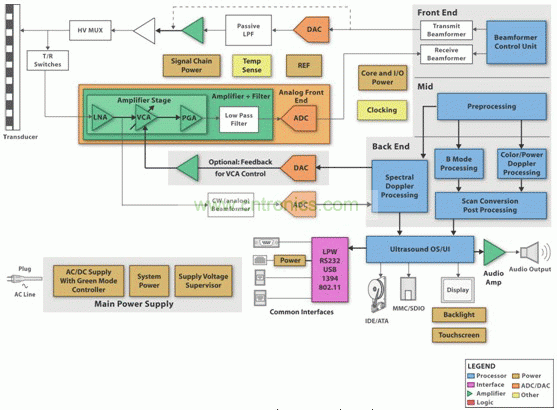 超聲波系統(tǒng)因其功能和性能不同而各異。例如,3D、4D 和諧波成像模式通常被用于高端系統(tǒng),而只有 2D B-模式成像和頻譜多普勒可能被用于一些低端系統(tǒng)。功能差異主要取決于數(shù)字后端。高 端超聲波系統(tǒng)要求更多和更快的計(jì)算能力,其需要具有接近實(shí)時(shí)信號(hào)處理的高端 DSP。很明顯,在高端便攜式系統(tǒng)之間實(shí)現(xiàn)共享信號(hào)處理單元是非常困難的。但是,在不考慮不同性能要求的情況 下,超聲波系統(tǒng)通常擁有相似的接收通道架構(gòu)。