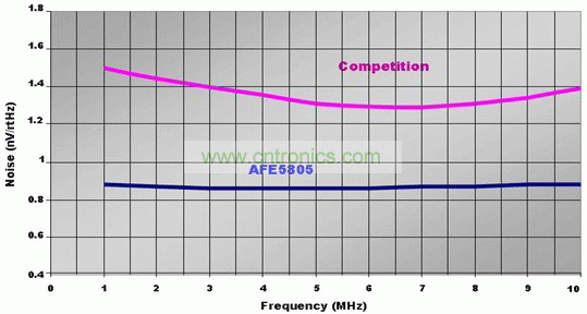 為了滿足上述標(biāo)準(zhǔn),我們需要一個(gè)超聲波 AFE(例如 TI 的 AFE5805)。最為先進(jìn)的 BiCMOS 和 CMOS 技術(shù)用于對(duì)功耗和噪聲性能進(jìn)行優(yōu)化。由于其低功耗、小芯片尺寸以及較低的閃爍噪聲, BiCMOS 工藝是 AFE5805 VCA 部分的理想之選。CMOS 工藝非常適用于模數(shù)轉(zhuǎn)換器。與同類解決方案相比,這些綜合的創(chuàng)新使尺寸縮小了 50%,功耗降低了 20%,噪聲減少了 40%。圖 2 所示的恒 定噪聲性能涵蓋了整個(gè)工作頻率范圍。因此,我們?cè)O(shè)計(jì)的便攜式超聲波系統(tǒng),可以實(shí)現(xiàn)卓越的圖像質(zhì)量以及最低的功耗。