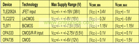 值得一提的一種寬輸入范圍特例是“軌到軌輸入運(yùn)算放大器”。盡管,顧名思義,它是一種輸入涵蓋整個(gè)電源軌范圍的運(yùn)算放大器,但并非所有軌到軌輸入器件都如許多人設(shè)想的那樣涵蓋整個(gè)電源范圍。許多軌到軌輸入運(yùn)算放大器的確涵蓋了整個(gè)電源范圍(例如:表1中的OPA333等),但有一些則沒(méi)有全覆蓋,而其描述對(duì)人具有一定的誤導(dǎo)性。另外,檢查產(chǎn)品說(shuō)明書(shū)中的規(guī)定輸入范圍至關(guān)重要。