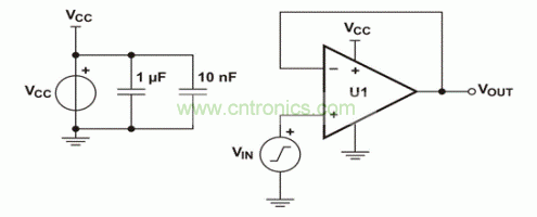 為了更好地理解超出VICMR帶來(lái)的影響,我們列舉出了一些此類違規(guī)的例子。我們選擇兩個(gè)不同VICMR規(guī)范的運(yùn)算放大器,以說(shuō)明這些影響。我們之所以選擇這些器件,是因?yàn)樗鼈兙哂熊壍杰壿敵?,可排除輸出?jí)帶來(lái)的一些限制。圖3所示單電源電壓跟隨器電路,用于獲取兩個(gè)器件的波形。所有數(shù)據(jù)均在~25°C室溫下的實(shí)驗(yàn)臺(tái)獲取。