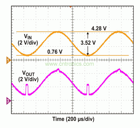 為了測(cè)試該電路,我們將VCC/2 = 5V DC偏移的300 Hz正弦波應(yīng)用于輸入端。在VOUT出現(xiàn)變化以前,一直對(duì)AC幅值進(jìn)行調(diào)節(jié)。如圖4所示,當(dāng)應(yīng)用10 Vp-p輸入時(shí),VOUT在正軌附近出現(xiàn)一個(gè)經(jīng)削波的信號(hào),而非負(fù)軌附近。如果輸入超出VCC – 0.8V(本例中為9.2V),這種正軌附近出現(xiàn)的非理想行為是我們能夠預(yù)計(jì)到的。9.2V以下VIN電平和低至0V時(shí),VOUT顯示出正確的波形,正如我們所預(yù)期的那樣。