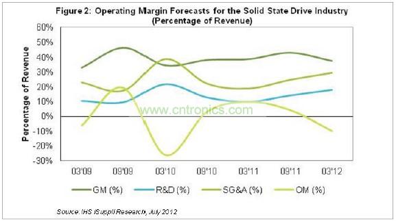 上次SSD產(chǎn)業(yè)出現(xiàn)營業(yè)利潤普遍為負(fù)的情況是在2010年上半年,與目前的情形類似。當(dāng)時,幾家廠商加大銷售力度,以改善略高于35%的毛利率。這些努力取得了一些效果,2011年中期毛利率自2009年以來首次升到了40%以上。但由于產(chǎn)業(yè)競爭加劇和營業(yè)費(fèi)用增加,SSD毛利率在2011年第四季度重新跌至40%以下。