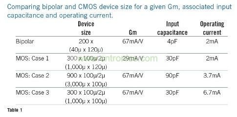 表1是用于放大器的雙極性器件和CMOS器件的尺寸比較。CMOS器件較大的尺寸及伴隨的輸入電容嚴(yán)重限制了放大器的輸入帶寬。在本例中,采用雙極性放大器可實(shí)現(xiàn)低偏置電流下的低噪聲。但使用雙極性器件可能會有基電流噪聲,而這在CMOS器件中則可以忽略不計(jì)。該基電流噪聲的幅度取決于傳感器的阻抗和系統(tǒng)具體的實(shí)施情況。