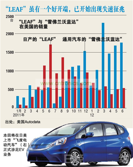 下圖為美國(guó)調(diào)查公司Autodata統(tǒng)計(jì)的、LEAF在美國(guó)市場(chǎng)的銷量走勢(shì)。該車于2010年12月上市,2011年銷勢(shì)良好,但進(jìn)入2012年之后銷售速度減慢,截止6月份已連續(xù)三個(gè)月低于上年同月。與競(jìng)爭(zhēng)車型——美國(guó)通用汽車(GM)的“雪佛蘭·沃藍(lán)達(dá)”在銷量上發(fā)生了逆轉(zhuǎn)。