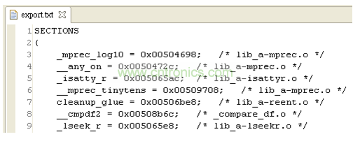 (2) patch在編譯之前,先匯入主程序的symbol table。(將export.txt檔案放在一起編譯)。Patch的linker script要匯入主程序的symbol,寫法如下面紅色字體。