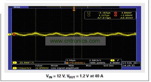 由于每個(gè)輸出電感中存儲(chǔ)的能量降低,負(fù)載瞬態(tài)性能隨之提高。電流抵消帶來(lái)的紋波電壓降低,幫助實(shí)現(xiàn)了最小輸出電壓過(guò)沖和下沖,因?yàn)樵诃h(huán)路響應(yīng)以前許多周期都已結(jié)束。紋波電流越低,干擾越小。