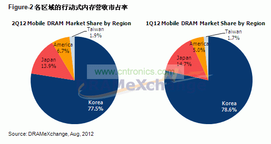 第二季行動式內存營收,三星半導體市占逼近全球60%,仍穩(wěn)居龍頭之位,韓系廠商占全球行動式內存營收的77.5%,較第一季僅小幅減少1.1%。第三名的日商爾必達市占則是小幅下滑0.8%來到13.9%,美商美光科技則受惠于中低階智能型手機的成長,市占小幅成長至6.7%,位居第四。臺系DRAM廠亦在行動內存市場中試圖搶占一席之地,除了華邦電子之外,南科亦在本季營收當中初次嶄露頭角,目前比重雖然不高,但也為整個行動式內存的市場帶來不同的氛圍。值得注意的是由于下半年受到景氣不確定因素的影響,各家內存制造商在下半年生產與開發(fā)的計劃也逐漸轉趨于保守,謹慎應對自2009年以來最嚴峻的景氣寒冬。