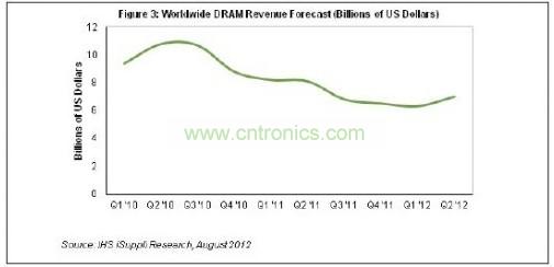 2012年第二季度DRAM營業(yè)收入為70億美元,比第一季度的63億美元勁增11%,如圖1所示。這是DRAM產(chǎn)業(yè)自2010年第二季度以來首次增長,上個季度的營業(yè)收入是四年來的第三低水平。廠商對下滑局面得到扭轉(zhuǎn)感到高興,盡管第二季度營業(yè)收入遠低于2010年同期的90億-100億美元。