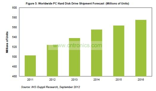 預(yù)計(jì)2012年總體PC市場的硬盤出貨量將達(dá)到5.24億個(gè),比去年的5.025億個(gè)增長4.3%。2012年出貨量將創(chuàng)下硬盤產(chǎn)業(yè)的最高紀(jì)錄,但好景不長。實(shí)際上,預(yù)計(jì)硬盤出貨量將持續(xù)爬升,每年出貨量都將更上層樓,至少直到2016年。預(yù)計(jì)2016年出貨量將達(dá)到5.751億個(gè),如圖所示。