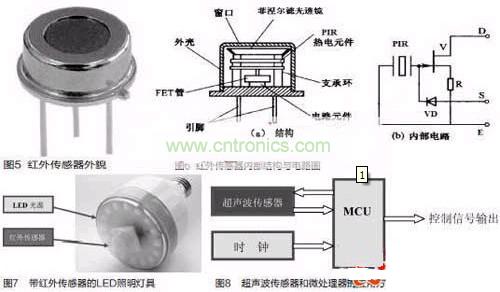 被動(dòng)式紅外傳感器有三個(gè)關(guān)鍵性的元件:菲涅爾濾光透鏡,熱釋電紅外傳感器和匹配低噪放大器。菲涅爾透鏡有兩個(gè)作用:一是聚焦作用,即將熱釋紅外信號(hào)折射在PIR上:二是將探測區(qū)內(nèi)分為若干個(gè)明區(qū)和暗區(qū),使進(jìn)入探測區(qū)的移動(dòng)物體/人能以溫度變化的形式在PIR上產(chǎn)生變化的熱釋紅外信號(hào)。一般還會(huì)匹配低噪放大器,當(dāng)探測器上的環(huán)境溫度上升,尤其是接近人體正常體溫(37℃)時(shí),傳感器的靈敏度下降,經(jīng)由它對(duì)增益進(jìn)行補(bǔ)償,增加其靈敏度。輸出信號(hào)可用來驅(qū)動(dòng)電子開關(guān),實(shí)現(xiàn)LED照明電路的開關(guān)控制。圖5是紅外傳感器外貌,圖6是紅外傳感器內(nèi)部結(jié)構(gòu)與內(nèi)部電路圖。圖7是帶紅外傳感器的LED照明燈具,這是一款E27標(biāo)準(zhǔn)螺口燈頭的燈具,其電源適用范圍是AC180V-250V(50/60Hz),紅外傳感器檢測范圍大約在3m~15m,其標(biāo)準(zhǔn)產(chǎn)品IFS-Bulb3W燈具達(dá)80lm,5W燈具達(dá)140lm.在LED光源模塊的中央部分嵌入紅外線傳感器。一旦紅外傳感器檢測到人的體溫,LED電燈泡將會(huì)在50s內(nèi)自動(dòng)開啟與關(guān)閉。適用于任何一種室內(nèi)應(yīng)用,如走廊、儲(chǔ)藏室、樓梯和大廳入口處。