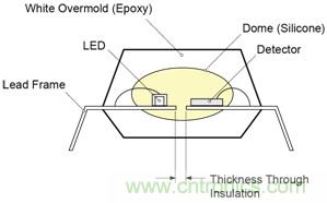 飛兆半導(dǎo)體的 FODM8801 OptoHiT 系列采用專有 OPTOPLANAR® 共面封裝技術(shù)進行封裝,這有助于提高低電流下的性能。 圖 2 展示了 OPTOPLANAR 技術(shù)的截面圖。