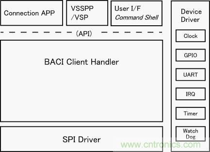 BACI通過簡化與主機之間的通信來降低訪問頻率。而且,在結構設計上采用通過事件使主機啟動的結構,因此,是盡可能使主機停動來抑制耗電量的設計。綜上所述,本LSI在整個結構模塊上進行了降低耗電量的設計,從而,使紐扣電池驅動3年以上連續(xù)工作成為可能。主機和堆棧結構如圖2所示。