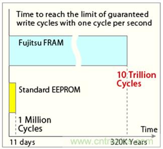 FRAM是一種兼具非揮發(fā)性與隨機(jī)存取功能的存儲(chǔ)器,能在沒有電源的情況下可儲(chǔ)存及高速寫入數(shù)據(jù)。值得注意的是,在眾多非揮發(fā)性內(nèi)存技術(shù)中,F(xiàn)RAM能保證一萬(wàn)億次以上的寫入/擦除周期。富士通半導(dǎo)體自1999年開始量產(chǎn)FRAM產(chǎn)品以來(lái),已將上述產(chǎn)品特性廣泛應(yīng)用在工廠自動(dòng)化設(shè)備、測(cè)試儀器、金融終端機(jī)及醫(yī)療裝置等領(lǐng)域。